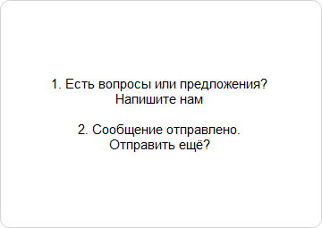 Если пользователь желает написать сообщение, открывается стандартная форма.... имя почта, поле для ввода сообщения. Перед тем как начать писать сообщение, в поле отображается надпись (Есть вопросы или предложения? Напишите нам) После того как пользователь отправил сообщение, в поле появляется другая надпись. (Сообщение отправлено. Отправить ещё? ) Если пользователь нажимает на поле он может написать еще и так далее.. Нажимая стрелку обратно возвращается на страницу настроек. Нажимает на иконку закрыть, возвращается в то место, от куда заходил в настройки.